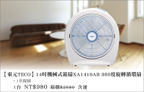 | 東元TECO-14吋機械式箱扇XA1410AB 360度旋轉循環扇-東元14吋循環扇,360度雙向旋轉,三速風速可選,調節空氣流通,讓整個空間更為涼爽,搭配冷氣效果更佳只要980元(含運)即可購得【東 售價:980 我要購買 |
